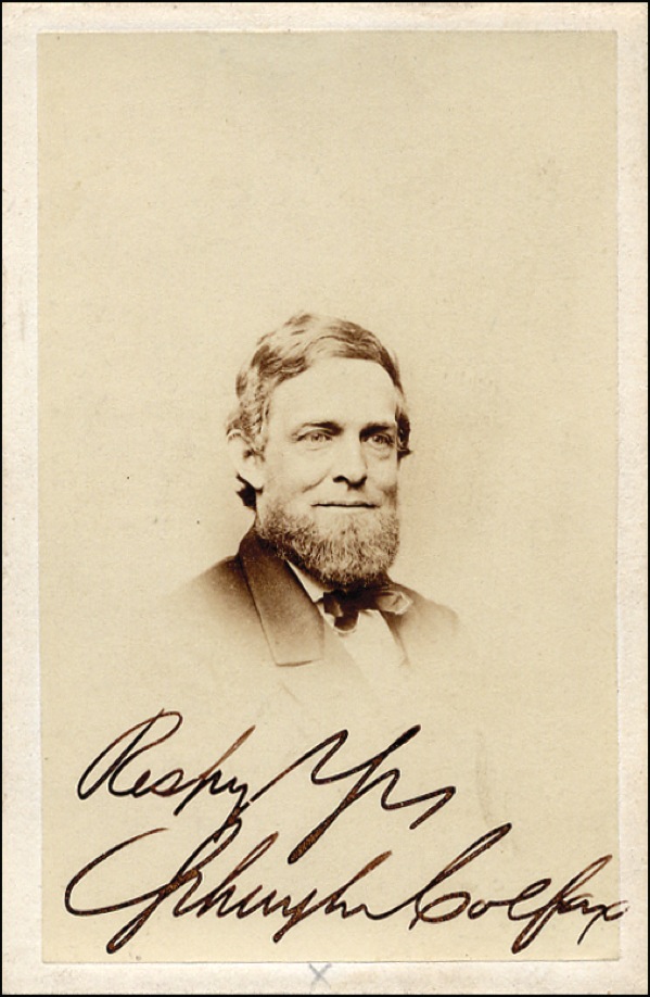 Vice president under Grant whose political career was ruined by his involvement in the Credit Mobilier affair and other scandals. Shoulder-length CDV photo, 2.5 x 3.75, signed in ink below the image, “Respy. yrs., Schuyler Colfax.” Expertly inlaid to a larger card to an overall size of 5 x 7.75. In fine condition, with a touch of soiling. R&R COA.