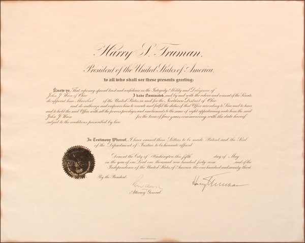 DS as president, one page, 20 x 16, May 5, 1949. President Truman appoints John J. Wein to the post of “Marshall of the United States in and for the Northern District of Ohio.” Boldly signed at the conclusion in black ink by Truman and countersigned by Attorney General . In fine condition, with a light overall shade of toning to document, a bit heavier to the extreme edges and a small area of loss to gold foil seal. COA John Reznikoff/PSA/DNA and R&R COA.