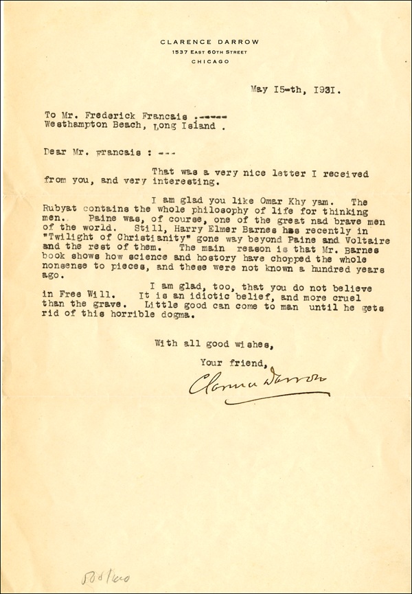 Brilliant defense attorney noted for his role in the Scopes Monkey Trial and the Leopold-Loeb thrill killing case. TLS, one page, 7.25 x 10.5, personal letterhead, May 15, 1931. Very interesting letter to a friend concerning different philosophical outlooks. In full, “That was a very nice letter I received from you, and very interesting. I am glad you like Omar Khy yam [sic]. The Rubyat contains the whole philosophy of life for thinking men. Paine was, of course, one of the great nad [sic] brave men of the world. Still, Harry Elmer Barnes has recently in ‘Twilight of Christianity’ gone way beyond Paine and Voltaire and the rest of them. The main reason is that Mr. Barnes book shows how science and hostory [sic] have chopped the whole nonsense to pieces, and these were not known a hundred years ago. I am glad, too, that you do not believe in Free Will. It is an idiotic belief, and more cruel than the grave. Little good can come to man until he gets rid of this horrible dogma.” In fine condition, with two horizontal mailing folds, a light shade of toning and some minor wrinkling. COA John Reznikoff/PSA/DNA and R&R COA.
