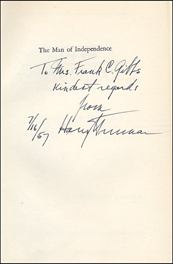 Signed book: The Man of Independence. Philadelphia: J. B. Lippincott Company, 1950. Hardcover, 6 x 8.5, 384 pages. Signed and inscribed on the half-title page, “To Mrs. Frank C. Gibbs, Kindest regards from Harry S. Truman 7/16/57.” In fine condition, with some light wear to covers and some slight binding separation along binding. R&R COA.