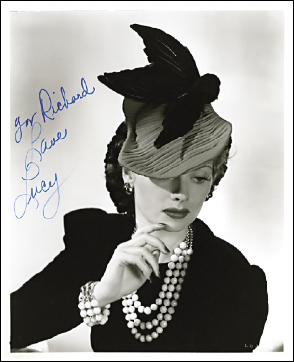 Glossy 8 x 10 photo, signed and inscribed in blue felt tip “For Richard, Love, Lucy.” Light creasing to three corners and a few other creases, impressions and surface marks, otherwise fine condition. R&R COA.