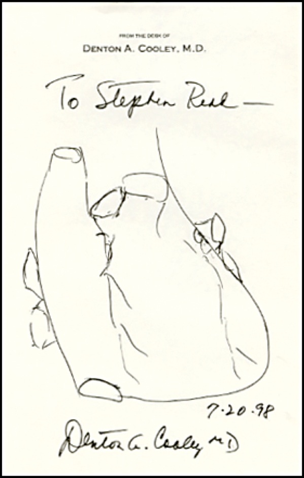 Famed heart transplant surgeon. Original signed and inscribed felt tip sketch of a human heart, dated July 20, 1998, on a sheet of his personal stationery; and a glossy 5 x 7 photo of Cooley, also signed in black felt tip. In fine condition. R&R COA.