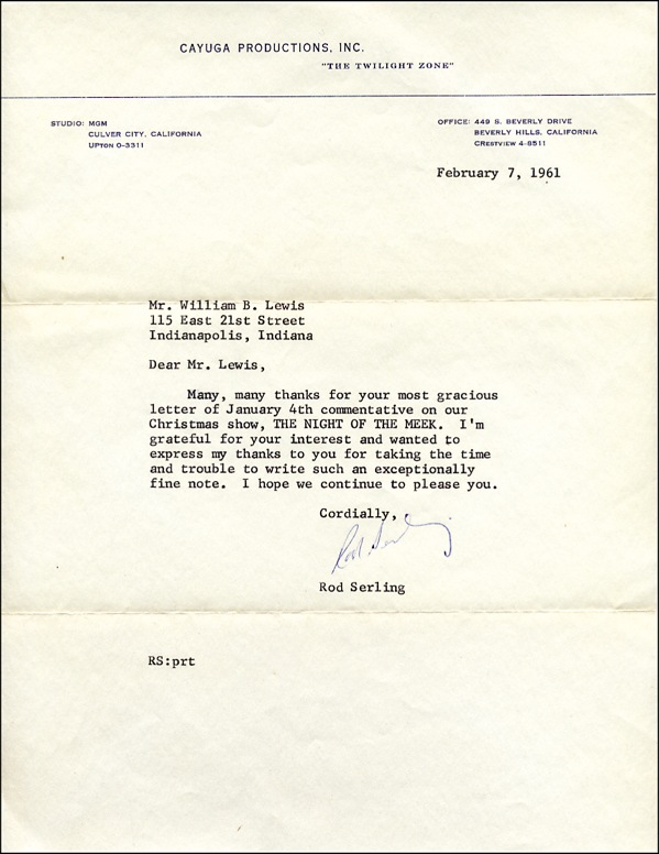 TLS, one page, 8.5 x 11, Twilight Zone letterhead, February 7, 1961. In full: “Many, many thanks for your most gracious letter of January 4th commentative on our Christmas show, THE NIGHT OF THE MEEK. I’m grateful for your interest and wanted to express my thanks to you for taking the time and trouble to write such an exceptionally fine note. I hope we continue to please you.” The episode in question, which originally aired during the show’s second season, starred Art Carney as a magical department-store Santa who becomes the “real” Santa. Accompanied by the original mailing envelope. In fine condition, with usual mailing folds. R&R COA.