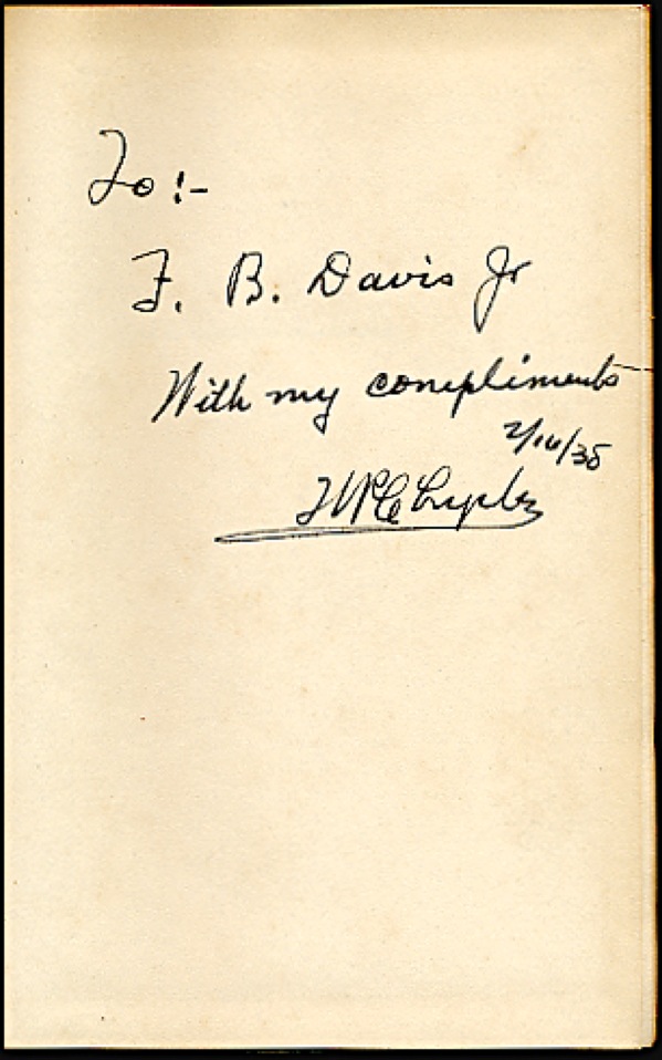 Automotive mogul and founder of the Chrysler Corporation. Signed book: An American Workman. NY: Privately printed for the author, 1937. Leather-bound hardcover with gilt-stamped facsimile signature, 6.5 x 9.5, 203 pages. Limited edition of 500 copies (this copy No. 191), signed and inscribed on a front blank, “To: F. B. Davis Jr. with my compliments, W. P. Chrysler, 2/16/38.” Rubbing and surface loss to leather (primarily affecting spine) and mild even toning to interior, otherwise in fine condition. R&R COA.
