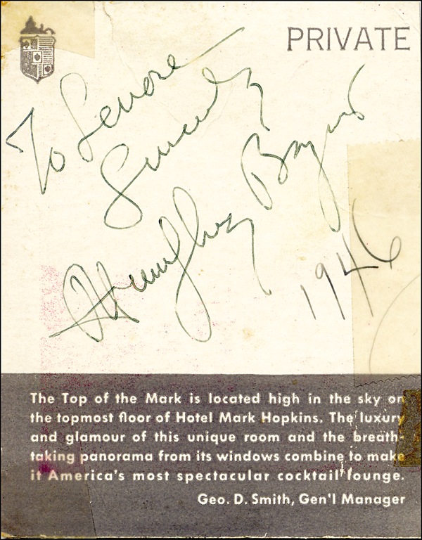 Vintage ink signature and inscription, “To Lenore - Sincerely, Humphrey Bogart,” on an off-white 2.75 x 3.5 Top Of The Mark Cocktail Lounge card, dated 1946 (the year The Big Sleep was released). Card is stamped “Private” along the top right corner. Two small tape remnants, one over portion of date, a few light creases and some light color remnants, possibly from a stamp, otherwise fine condition. PSA/DNA COA and R&R COA.