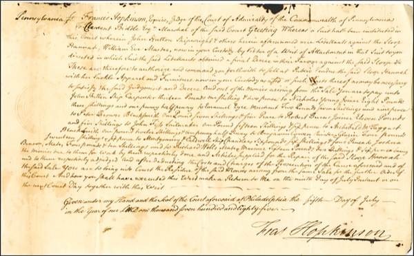 Signer of the Declaration of Independence, he also assisted in the design of the US flag. DS, signed “Fras. Hopkinson,” one page, 11.75 x 7.25, July 5, 1785. Document ordering the sale of a ship named Sloop Hannah from the owner William Eve Master, whereas the Sloop Hannah is to be sold at Public Venue with the proceeds being paid to the ship’s carpenter, John Sutton and four others. Signed at the conclusion in black ink by Hopkinson. In very good condition, with impressed Pennsylvania seal, scattered light toning and soiling, a few ink spots to last name of signature and several vertical folds. COA John Reznikoff/PSA/DNA and R&R COA.