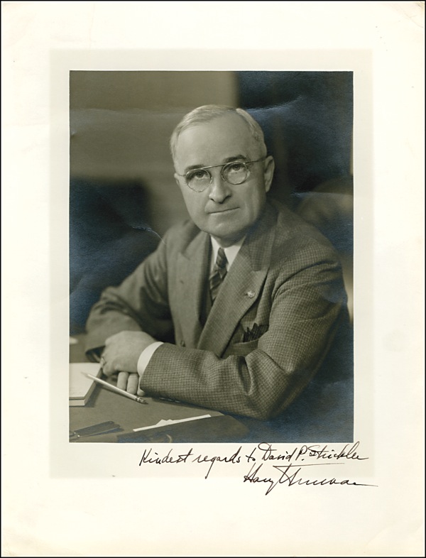 Vintage matte-finish 10.5 x 13 photo of Truman posing confidently at his desk, signed and inscribed in fountain pen “Kindest regards to David P. Stickler, Harry S. Truman.” Scattered silvering to darker areas and a few light creases to corners and background, otherwise fine condition. R&R COA.