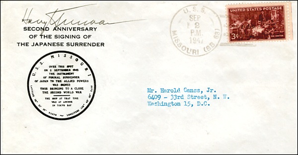 Commemorative cover, 6.5 x 3.75, with a cachet honoring the second anniversary of the signing of the Japanese surrender, signed in the top left corner in black ink by Truman. In fine condition, with a 1947 U.S.S. Missouri postmark and a typed address to front. COA John Reznikoff/PSA/DNA and R&R COA.