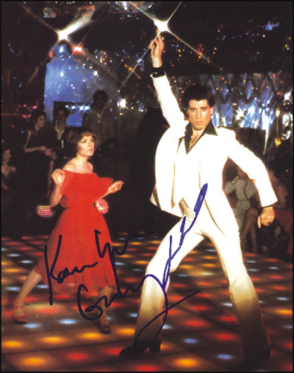 Color glossy 8 x 10 photo of John Travolta and Karen Lynn Gorney on the dance floor, signed by each in blue felt tip. In fine condition. R&R COA.