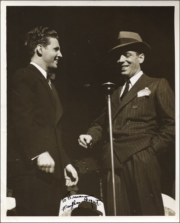 Wonderful vintage glossy 8 x 10 photo of Bogart smiling and standing in front of a microphone in a pin-striped suit and fedora, looking very much the gangster, considerately signed and inscribed in a light area of the image in fountain pen “To Norma.” He is standing with bandleader Ozzie Nelson. In fine condition, with a few surface creases and impressions, corner creases, adhesive residue to the reverse from previous mounting. PSA/DNA COA and R&R COA.