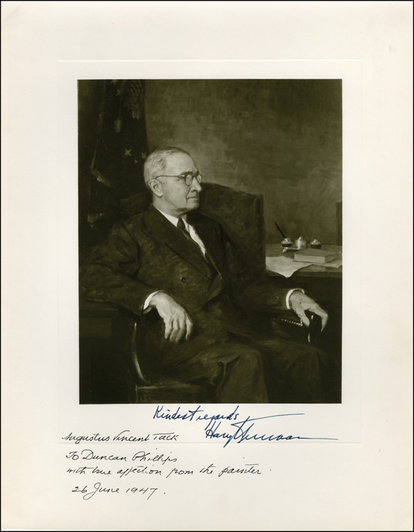 Vintage matte-finish 11 x 14 photo reproduction of a portrait of Truman, signed “Kindest regards, Harry Truman” in fountain pen. Also signed and inscribed “Augustus Vincent Tack to Duncan Phillips, with true affection from the painter, 26 June 1947.” In fine condition, with light edge toning, a mild corner bend. At the time of his death in July 1949 Augustus Vincent Tack had been working for several years upon a large triptych of President Truman and his military advisors at the end of World War II. Tack, an experienced mural and abstract painter, was encouraged by his patron, Duncan Phillips, founder of the Phillips Collection in Washington, and by David E. Finley, director of the National Gallery of Art. It was their hope that Congress would purchase these paintings for the future National Portrait Gallery. Tack had sittings with most of the subjects, including President Truman and General George Marshall, the two most central figures. Tack, however, died before completing the grand work. Phillips acquired the three canvases and his estate donated the largely finished central panel to the new National Portrait Gallery in 1968. The Gallery has subsequently acquired the two smaller side panels.COA John Reznikoff/PSA/DNA and R&R COA.