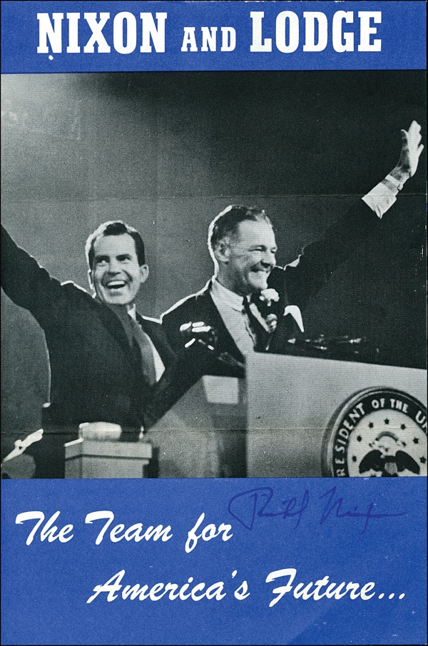 Nixon and Lodge 1960 two page campaign flier, 5.5 x 8.25, touting the two as “The Team for America’s Future,” complete with a printed endorsement from Dwight D. Eisenhower on the reverse, signed on the front in blue ink by Nixon. In fine condition, with two horizontal folds. R&R COA.