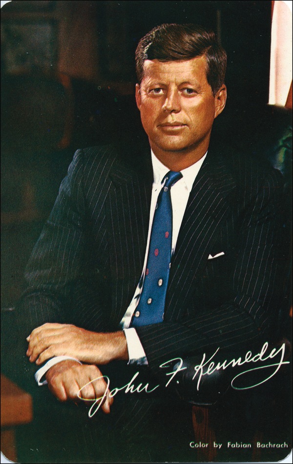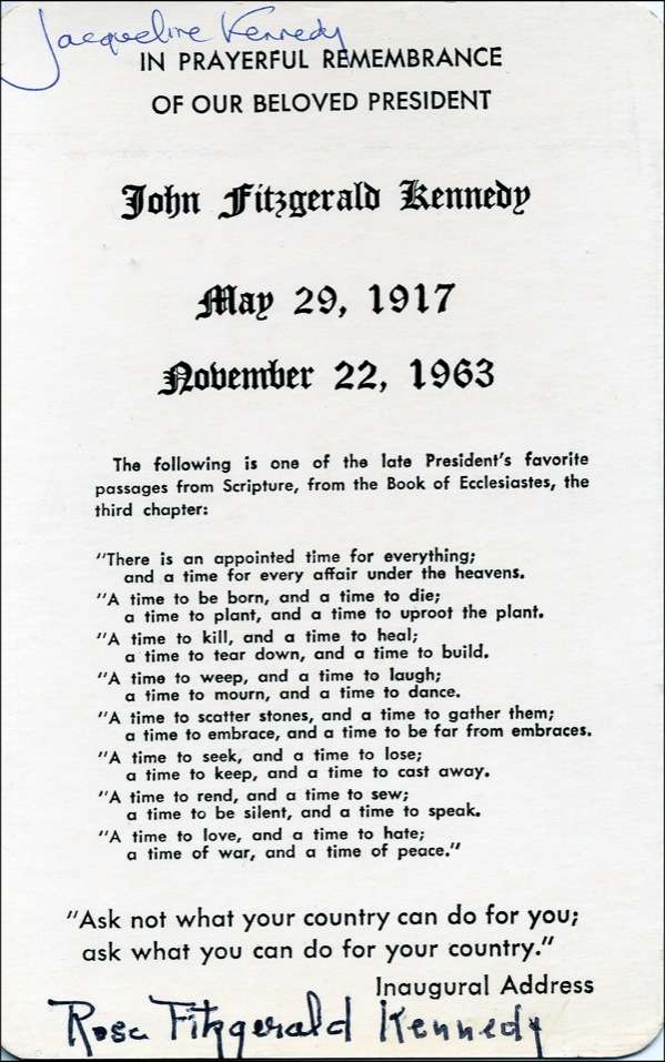 Original 3.5 x 5.5 memorial card for John F. Kennedy, featuring a color reproduction of a Bachrach photo of John Kennedy on one side, with a passage from Ecclesiastes and Kennedy’s memorable inaugural quote printed on the reverse. Signed across the top in blue ink, “Jacqueline Kennedy,” and across the bottom in black ink “Rose Fitzgerald Kennedy.” In fine condition, with a couple light surface impressions to image side from signatures on reverse. Very rare to see Jacqueline Kennedy sign one of her husband’s memorial card. COA John Reznikoff/PSA/DNA and R&R COA.