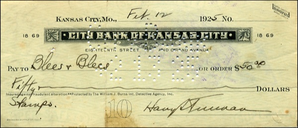 Check, 6.25 x 2.75, filled out and signed by Truman, payable to Blees & Blees for $50.00, February 12, 1925. In very good condition, with vertical fold to left side, expected cancellation holes, light show through from stamps on reverse and some light soiling. R&R COA.