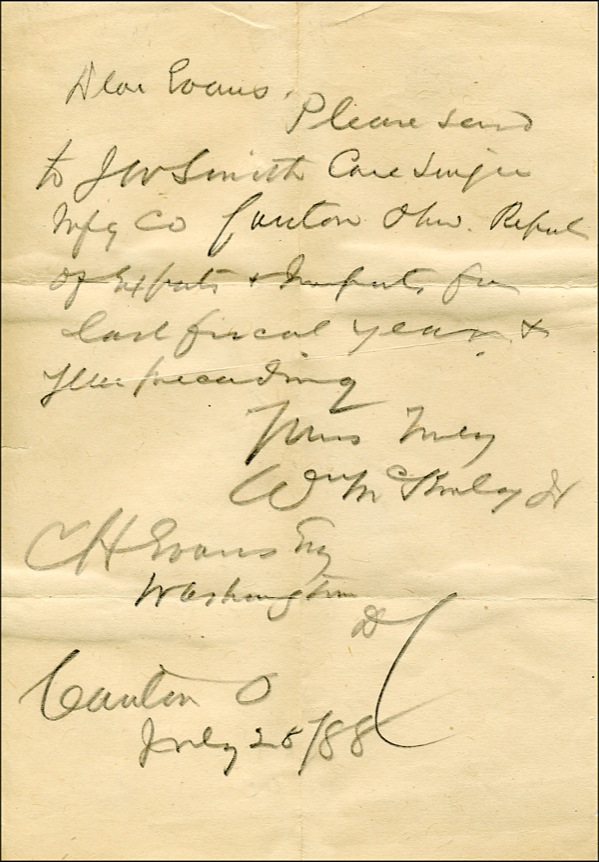 ALS signed “Wm. McKinley, Jr.,” one page, 5.5 x 8.25, July 28, 1888. Letter written by Congressman McKinley to a Mr. C. H. Evans. In full, “Please send to J. W. Smith care Singer Mfg. Co., Canton, Ohio, reports of exports and imports for last fiscal year & year preceding.” In fine condition, with expected mailing folds and a light shade of toning. COA John Reznikoff/PSA/DNA and R&R COA.