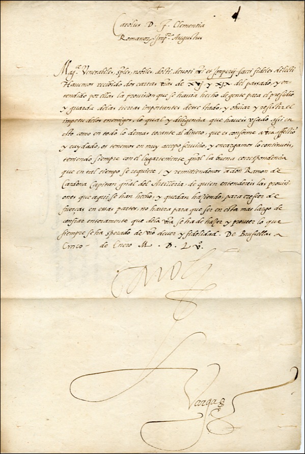 The last ruler of a united Spain and the Holy Roman Empire, he fought France to conquer the New World. A devout Catholic, Charles supported the Church and signed the Peace of Ausburg. In 1556, he retired and divided his empire between his brother Ferdinand and his son Philip. DS, in Latin, signed “Carolus,” one page, 8.25 x 12.25, 1555. Untranslated Latin document issued during the rule of George V, with intact seal on reverse and a countersignature at bottom. In fine condition, with two horizontal folds, several small areas of toning and a large signature. COA John Reznikoff/PSA/DNA and R&R COA.