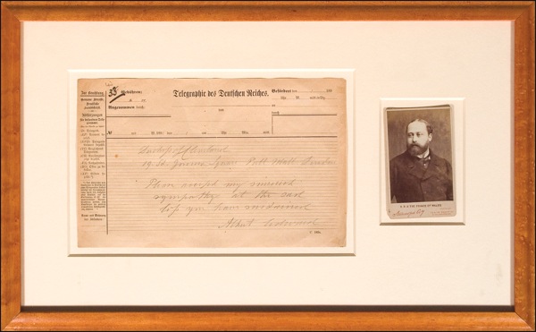 King of England, 1901–10; eldest son of Queen Victoria. Handwritten sympathy telegram, in pencil, signed “Albert Edward,” on a 10 x 6.5 off-white sheet of German telegraph paper to the Duchess of Cumberland. In full, “Please accept my sincerest sympathy at the sad loss you have sustained.” Matted and framed with an original 2.5 x 4.25 cabinet photo of Edward, to an overall size of 19.75 x 12.25. In fine condition, with a bisecting vertical fold, small ink notatioon to top left and light overall toning. R&R COA.