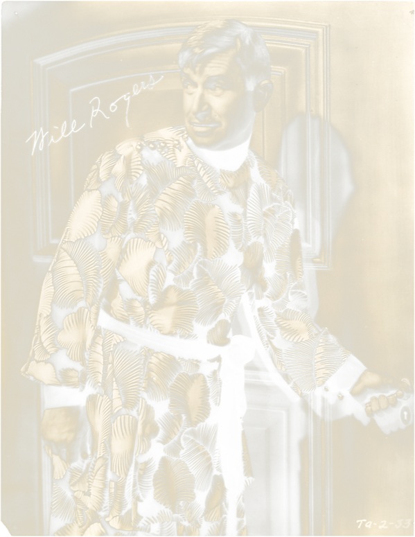 Uncommon vintage glossy 7 x 9 photo of Rogers in a kimono, evidently a scene from one of his films, signed in fountain pen. In fine condition, with scattered mild dings and surface impressions, a few pinholes, small chip to one corner, and very subtle touch of brushing to signature. PSA/DNA COA and R&R COA.