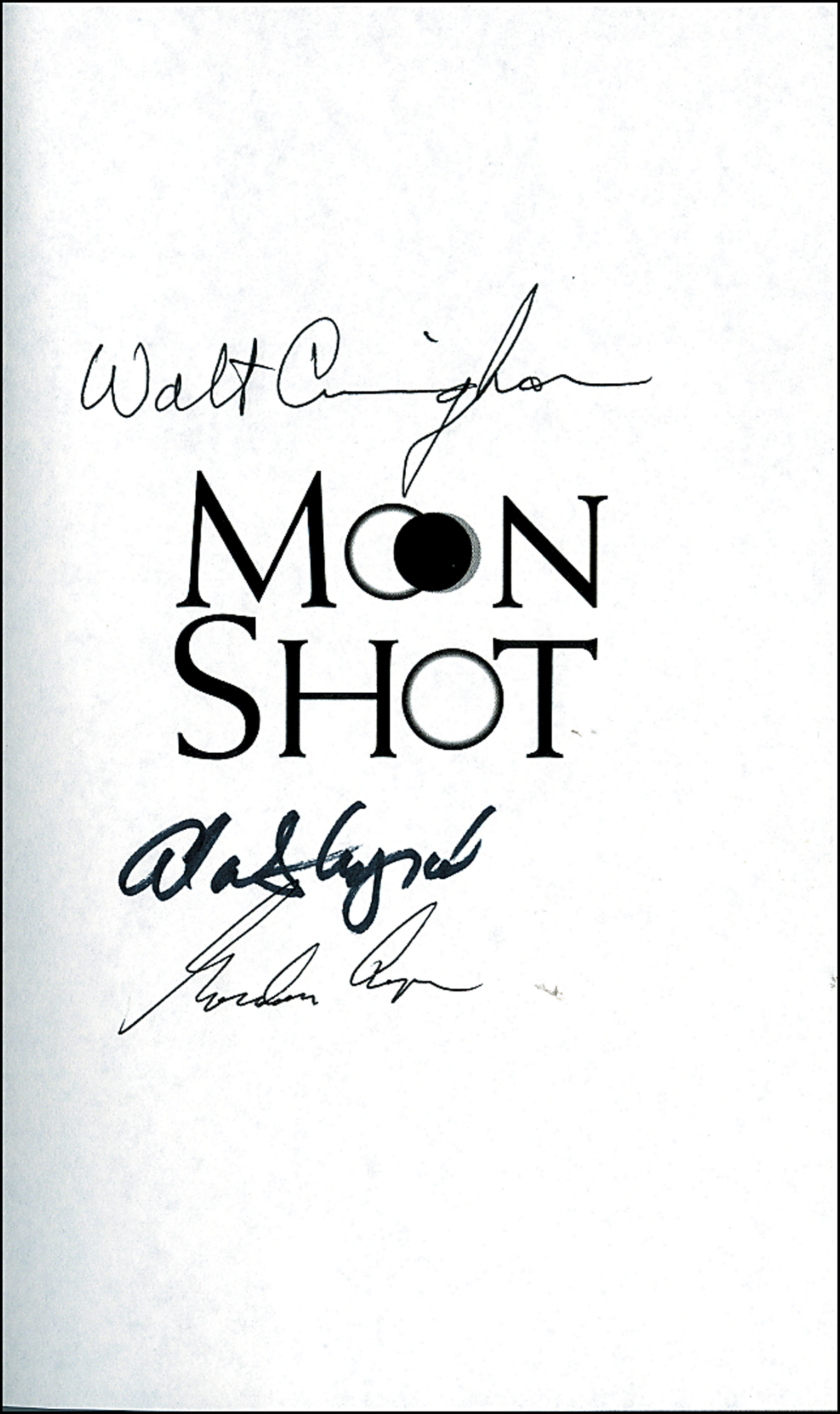 Signed book: Moon Shot. Atlanta: Turner Publishing, 1994. Hardcover with dustjacket, 6.25 x 9.25, 383 pages. Signed on the half-title page in black felt tip by Alan Shepard, Walt Cunningham and Gordon Cooper. In fine condition. COA Scott Cornish and R&R COA.
