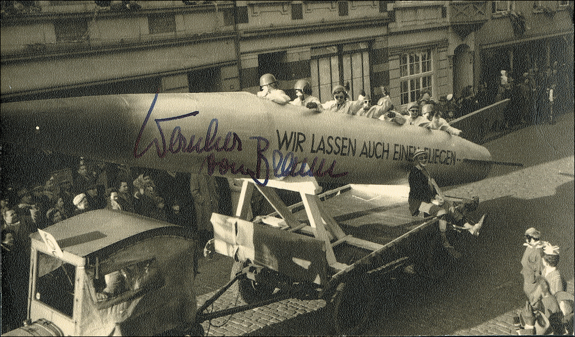 German rocket scientist who emigrated to the United States following World War II and assumed an instrumental role in the development of the American space program. Vintage matte-finish 5 x 3.5 postcard photo showing several men seated in a rocket bearing the legend (in German) “We also let one fly,” signed in fountain pen. In fine condition. R&R COA.