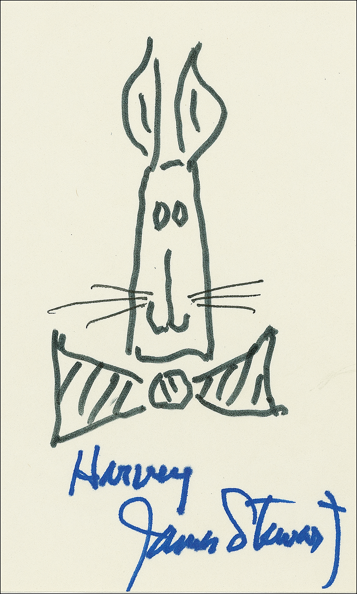 Original signed felt tip sketch of Harvey the Rabbit on an off-white 3 x 5 card, signed at the bottom “Harvey” and “James Stewart.” In fine condition. R&R COA.