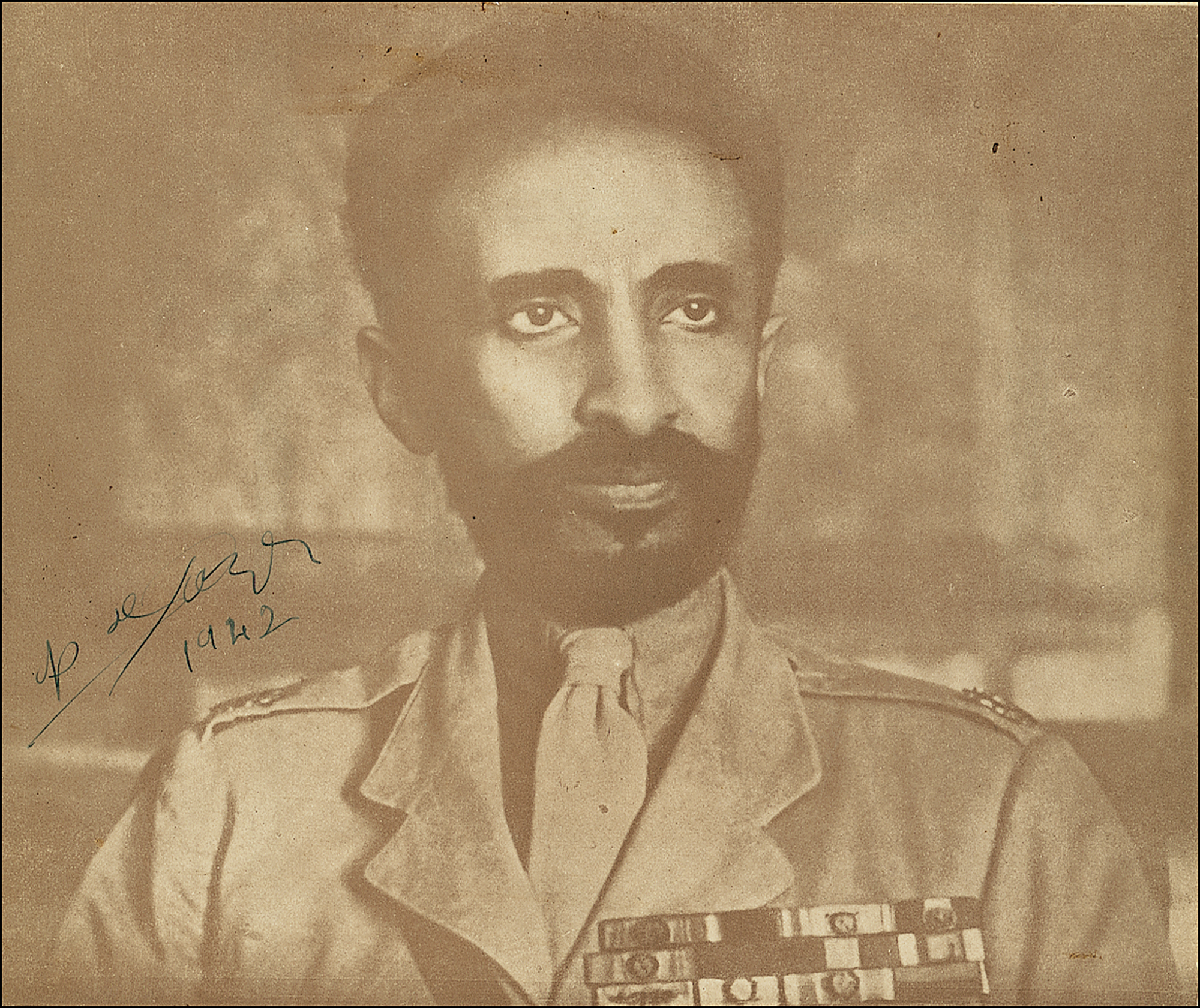 Longtime Emperor of Ethiopia (1892–1975) who reigned from 1930 to 1974. Selassie was one of the most revered figures among followers of the Rastafari movement, whose members viewed him as a symbol of God incarnate. Printed greeting card featuring a photo of Selassie in uniform on the front panel, 9 x 7.5, signed in fountain pen and dated 1942. In fine condition, with soiling and glue stains to interior, and a small, virtually invisible spot of adhesive residue to photo, well away from signature. Auction LOA John Reznikoff/PSA/DNA and R&R COA.