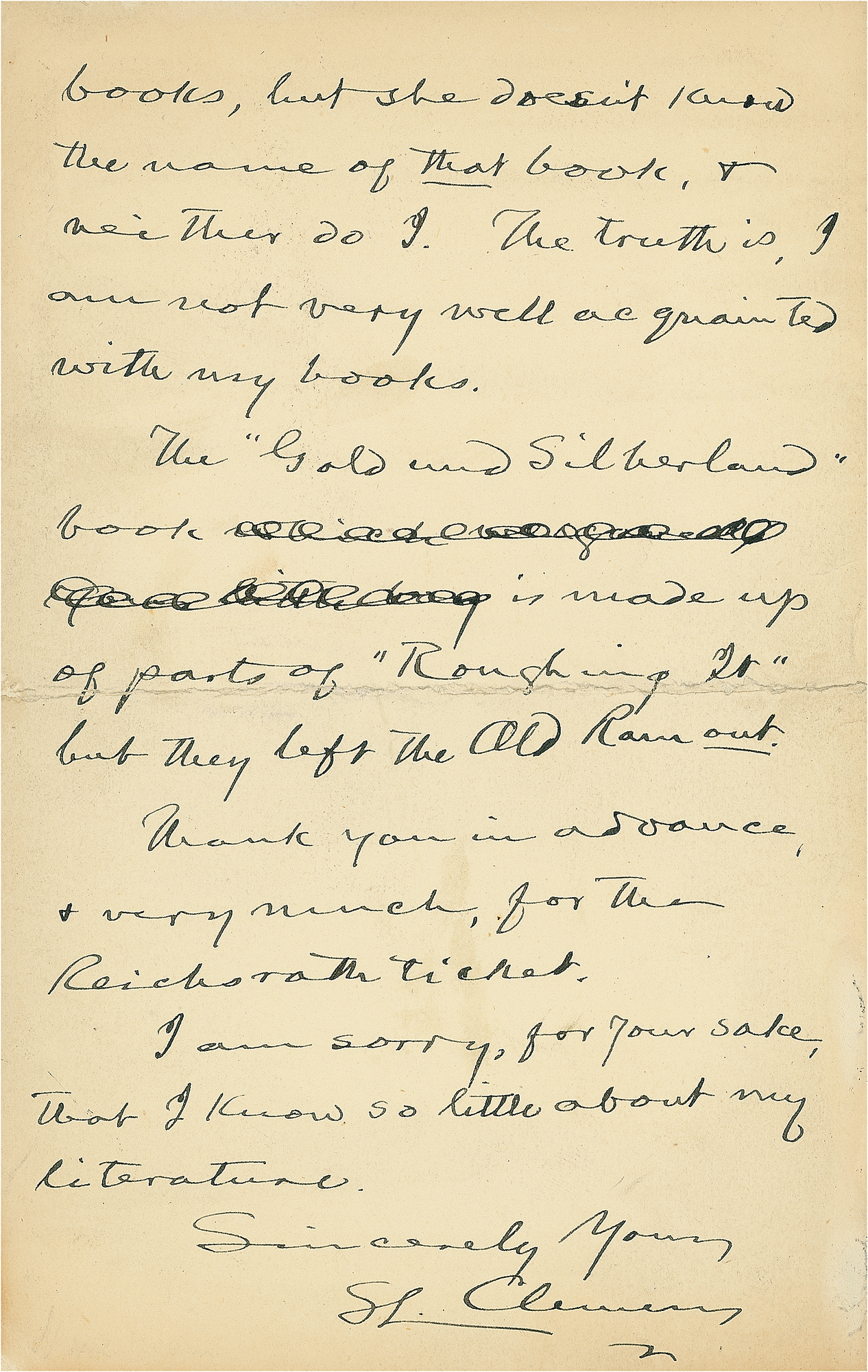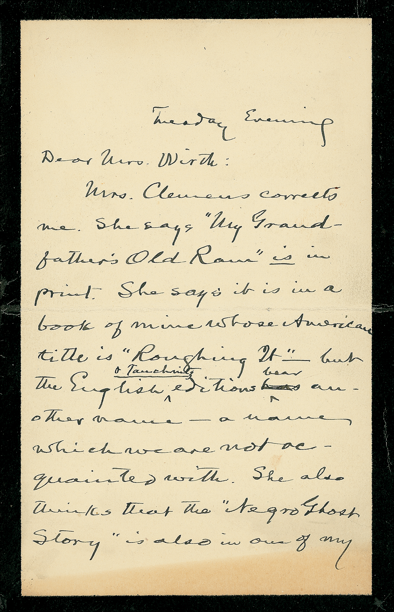 ALS signed “S. L. Clemens,” two pages, 4.5 x 7, black-bordered stationery, no date [Vienna, circa 1897]. Twain writes to Mrs. Wirth. In full: “Mrs. Clemens corrects me. She says ‘My Grandfather’s Old Ram’ is in print. She says it is in a book of mine whose American title is ‘Roughing It’—but the English & Tauchnitz editions bear another name—a name we are not acquainted with. She also thinks that the ‘Negro Ghost Story’ is also in one of my books, but she doesn’t know that name of that book, & neither do I. The truth is, I am not very well acquainted with my books. The ‘Gold and Silberland’ book is made up of parts of ‘Roughing It’ but they left the Old Ram out. Thank you in advance, & very much, for the Reichsrath ticket. I am sorry, for your sake, that I know so little about my literature.” Though the present letter is undated, another letter from Twain to the same recipient is known, dated October 28, 1897, at which time Twain was staying at the Metropole Hotel in Vienna. Twain’s use of mourning stationery was in commemoration of the death of his daughter Susy on August 18, 1896. In fine condition, with toning to bottom of first page and a heavy central fold to each page. Auction LOA John Reznikoff/PSA/DNA and R&R COA.