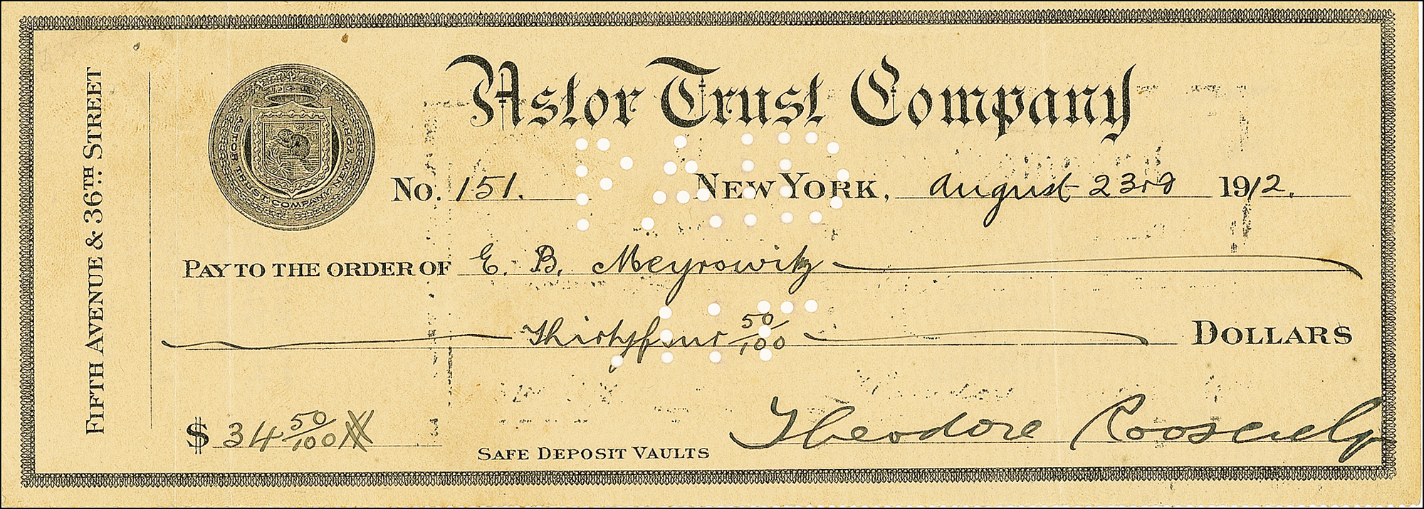 Check, drawn on the Astor Trust Company, 8.5 x 3, filled out in another hand and signed by Roosevelt, payable to E. B. Meyrowitz for $34.50, August 23, 1912. Meyrowitz was an optician in New York. In fine condition, with two vertical folds, expected holes and some light stamp remnants. Roosevelt’s signature prominently displays along bottom. LOA John Reznikoff/PSA/DNA and R&R COA.