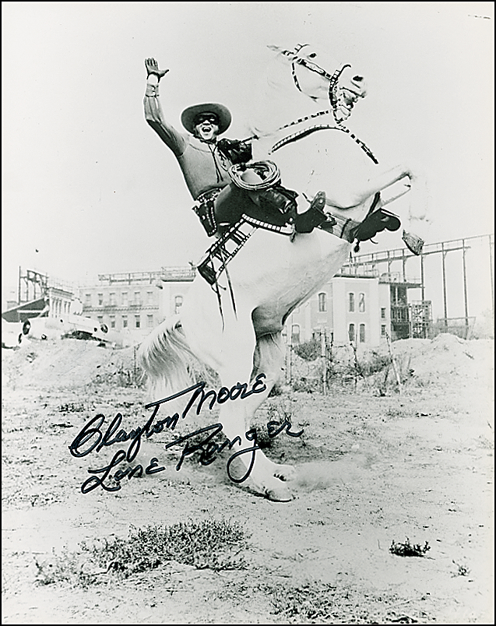 Glossy 8 x 10 photo of The Lone Ranger atop Silver, signed in black felt tip, “Clayton Moore, Lone Ranger”; and a glossy 10 x 8 photo of The Lone Ranger and Tonto, signed in black felt tip, “Clayton Moore, Lone Ranger.” In very fine condition. R&R COA.