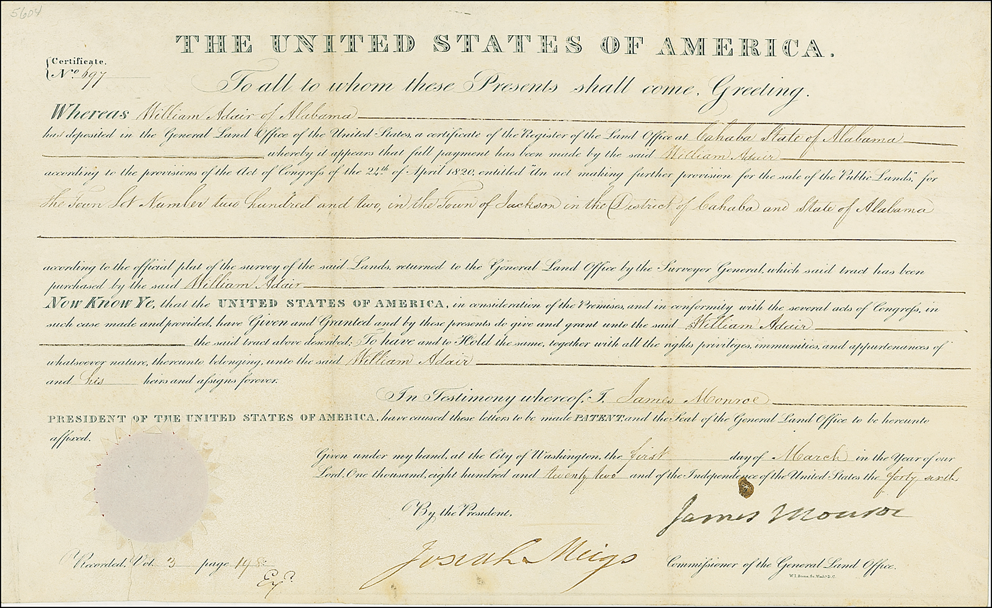 Partially printed DS as president, one page on vellum, 16.25 x 10, March 1, 1822. A document granting a parcel of land in Cahaba, Alabama to William Adair. The paper seal remains intact at lower left. One fold just touching first letter of signature, small spot near (but not touching) signature, and a few faint, tiny spots to blank portion—all mentioned merely for the sake of strict accuracy—otherwise very fine condition. An exceptionally bright, fresh example with a bold, beautiful signature! LOA John Reznikoff/PSA/DNA and R&R COA.