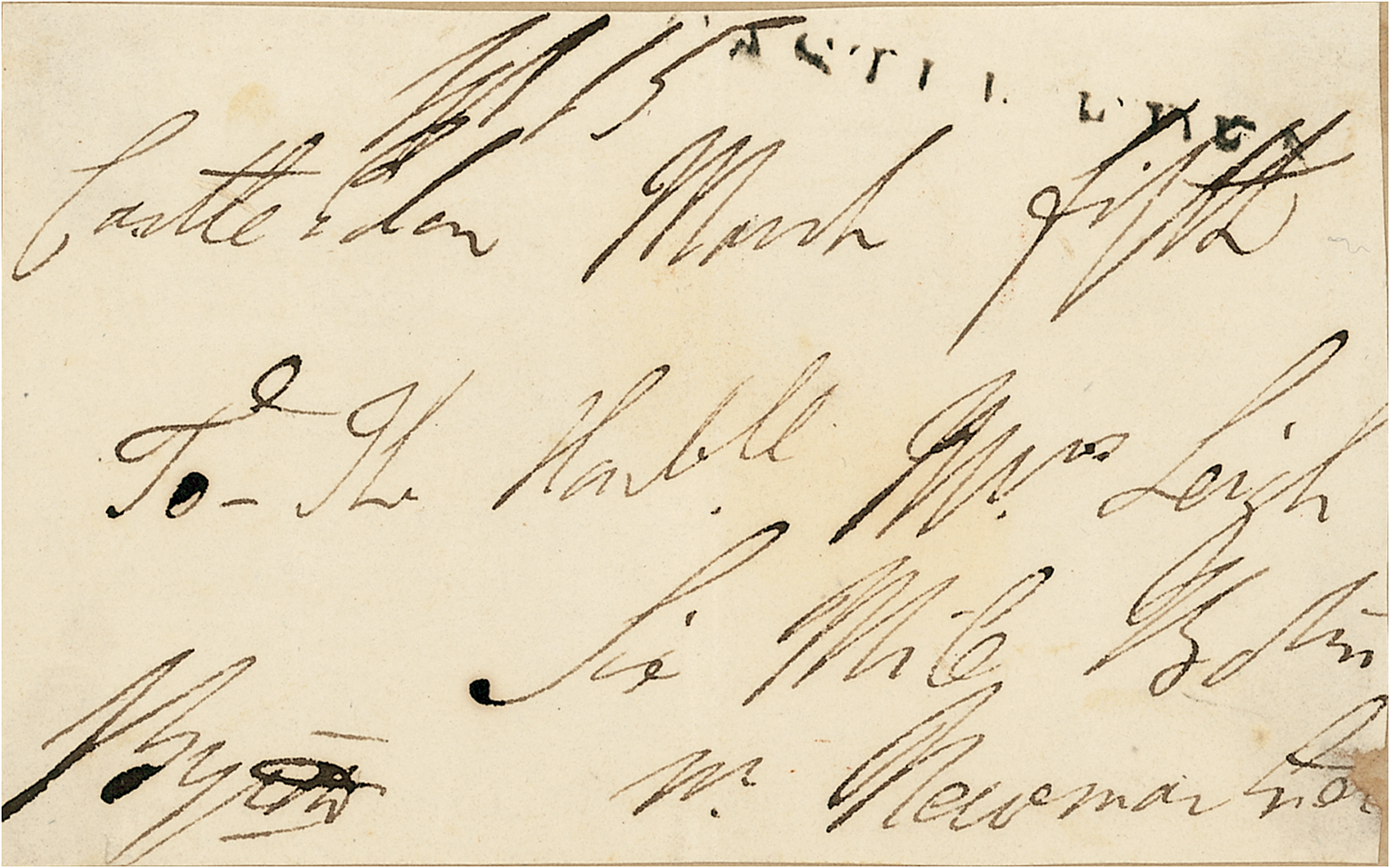 Highly influential British poet, politician, soldier, and adventurer, sexual and otherwise (1788–1824), who takes a place as the most colorful literary figure of the Romantic era. His works include such classics as Childe Harold’s Pilgrimage and Don Juan. Dark ink signature, “Byron,” on a 4.25 x 2.5 panel addressed in his hand to “The Honble. Mrs. [Augusta] Leigh” in Newmarket. The panel is affixed to a larger slip which bears the early ink notation “Lord Byron, given to Georgina Wheatley, by his sister Mrs. Leigh.” Leigh (1783–1851), Byron’s half-sister, is thought by many historians to also have been the poet’s intimate partner, and it is believed that the union produced a daughter, Elizabeth Medora Leigh. In fine condition, with faint vertical fold and small chip at right edge. R&R COA.