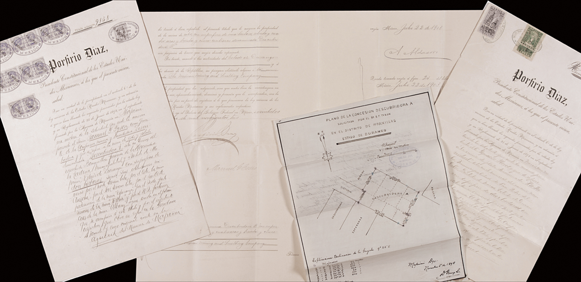 President of Mexico from 1877 to 1880 and 1884 to 1911. Lot of three partially printed mining-related DS in Spanish, each three pages on two adjoining sheets, approximately 10.5 x 16, 1890s. Díaz has signed as President of Mexico on the second page of each document. Accompanied by two hand-drawn mining-related schematics, both also in Spanish. In fine condition overall, with partial separations and a few tears along folds and mild scattered soiling and wrinkling. The signatures are large and distinct. R&R COA.