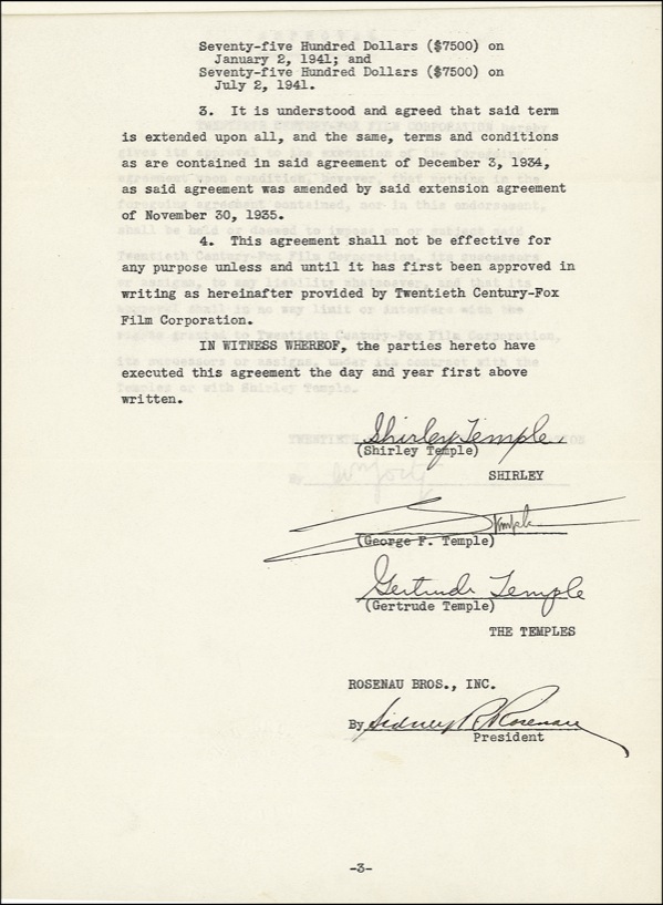 Easily the most popular and famous child star of all time. She got her start in the movies at the age of three and soon progressed to super stardom. Later in life she held several diplomatic and government posts. DS, four pages, 8.5 x 13, September 6, 1939. Second extension agreement between Shirley Temple, her parents George and Gertrude and the Rosenau Bros. Inc., regarding the manufacturing of Shirley Temple dresses, with Shirley and her parents receiving $30,000.00 over a two year period. Signed on the third page in black ink, “Shirley Temple,” and also signed by her parents, George and Gertrude. In fine condition, with expected folds and a bit of mild toning. Agreement remains stapled in its original legal folder. Shirley’s signature is large and bold. R&R COA.