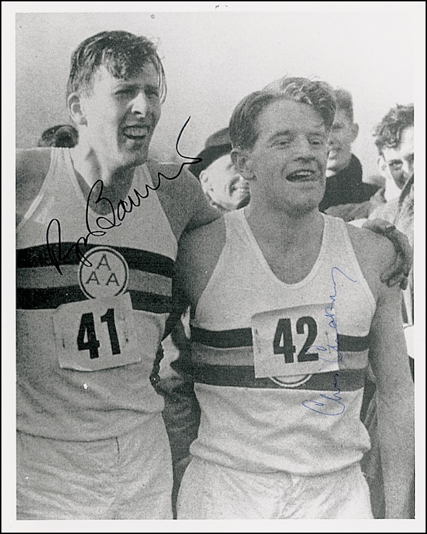 Glossy 8 x 10 photo of Bannister and Chataway embracing after Bannister’s record-setting feat, signed in black felt tip by Bannister and in blue ballpoint by Chataway. In very fine condition. LOA Steve Grad/PSA/DNA and R&R COA.