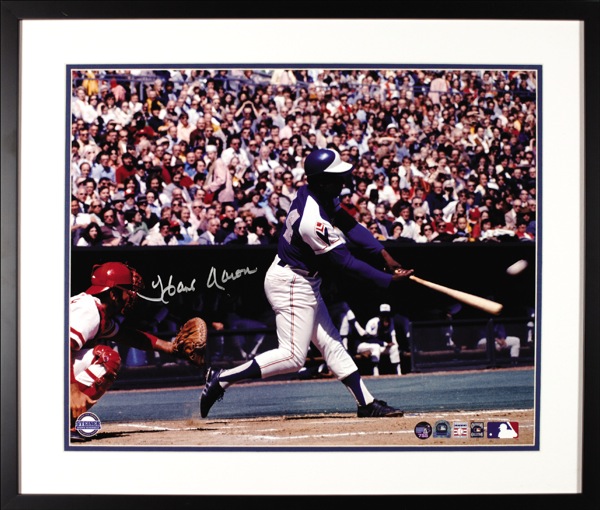 Color glossy 20 x 16 photo of Aaron belting out his then record-tying 714th home run against Cincinnati, signed in silver ink. Double matted and framed to an overall size of 25.5 x 21.5. In very fine condition. LOA Steve Grad/PSA/DNA, COA Steiner and R&R COA. Oversized.