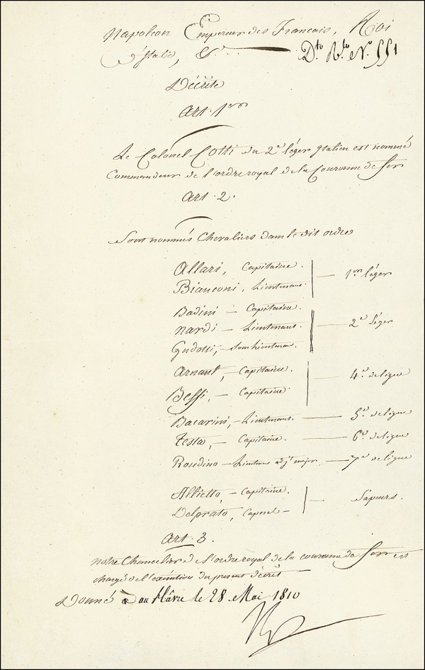 DS, in French, signed “Np,” one page, 8 x 13, May 28, 1810. Untranslated three article document, with the second article listing the names and ranks of twelve officers and enlisted men. A light shade of toning and a few light creases, otherwise very fine condition. LOA John Reznikoff/PSA/DNA and R&R COA.