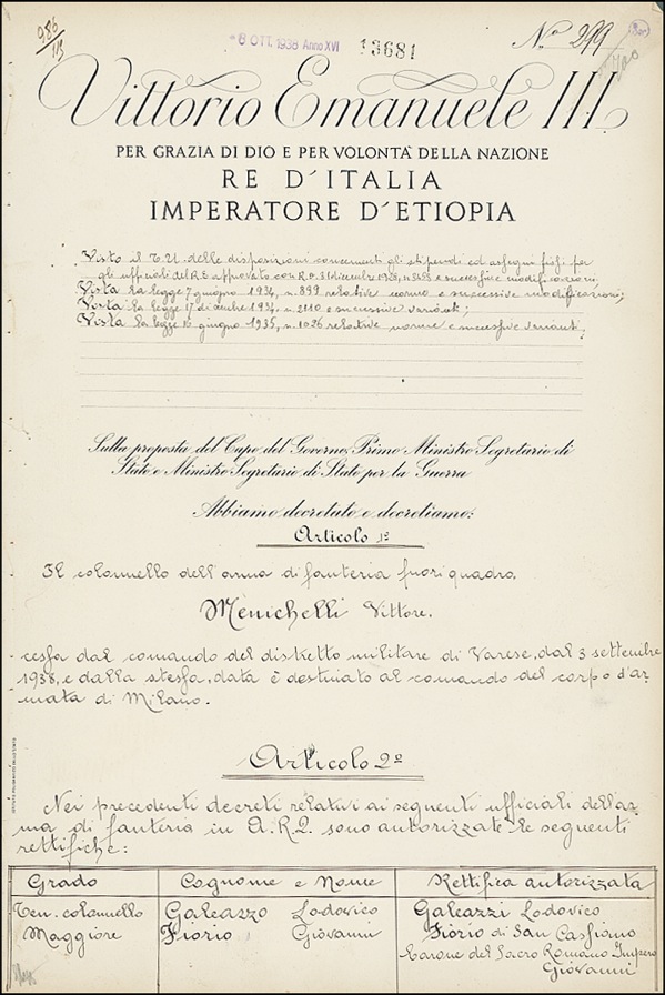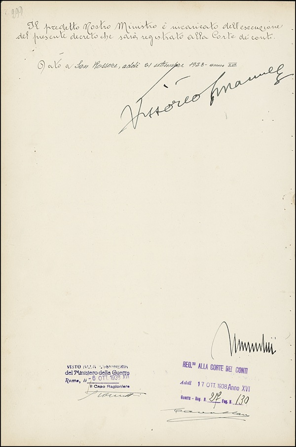DS, signed “Mussolini,” one page both sides, 9.5 x 14.5, October 17, 1938. Two article document issued during the reign of King Victor Emanuel III, signed “Mussolini” at the bottom of the page which also bears the king’s bold signature. Expected stamps and notations and marginal binding holes, otherwise fine condition. R&R COA.