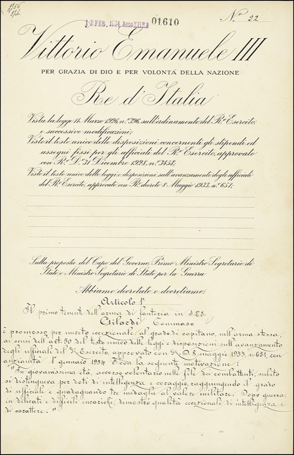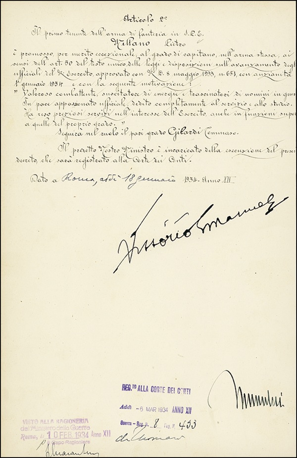 Partially printed DS, in Italian, one page both sides, 9.25 x 14.5, January 18, 1934. An untranslated military appointment, signed at the conclusion, “Vittorio Emanuel” and “Mussolini.” In fine, crisp condition, with horizontal fold and a touch of very subtle scattered soiling. R&R COA.