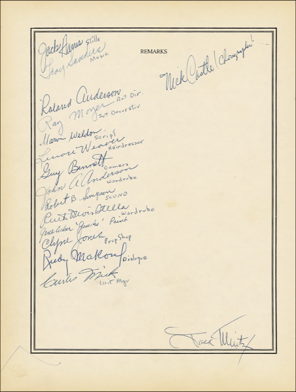 Partially printed souvenir sheet presented to Academy Award–winning director Norman Taurog, one page both sides, 9 x 12.25, signed by approximately twenty-eight cast and crew members from Taurog’s 1956 film Pardners, a remake of the 1936 Bing Crosby vehicle Rhythm on the Range. The signers range from the film’s stars to the hairdresser and dialogue supervisor. Among the more prominent personalities: Dean Martin, Jerry Lewis (“Here’s to plenty more”), Milton Frome, Jackie Loughery, Agnes Moorehead, Lori Nelson, John Baragrey, Jeff Morrow, Academy Award–winning cinematographer Daniel L. Fapp, Academy Award–winning art director Ray Moyer, and choreographer Nick Castle. In fine condition, with a hint of mild toning and soiling. R&R COA.
