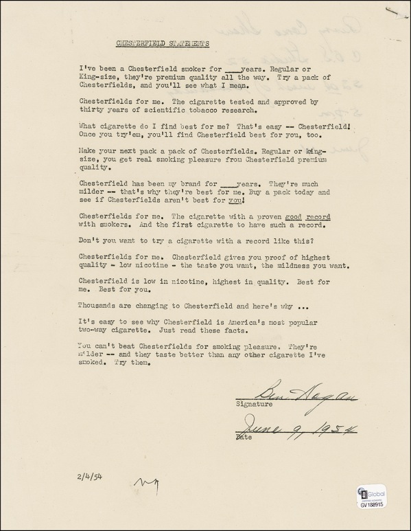 DS, one page, 8.5 x 11, June 8, 1954. Hogan signs off on a dozen Chesterfield testimonial statements, which he was presently endorsing. One reads, “Chesterfields for me. The cigarette tested and approved by thirty years of scientific research.” Signed at the bottom in fountain pen by Hogan, adding the date. In fine condition, with a staple to top right and an authentication label affixed to lower right. LOA Steve Grad/PSA/DNA and R&R COA.