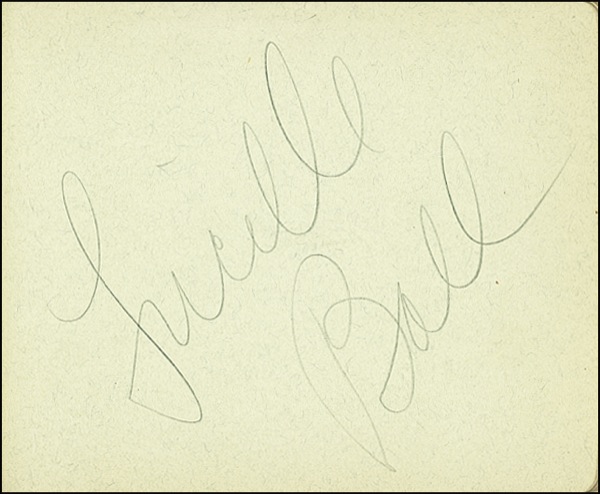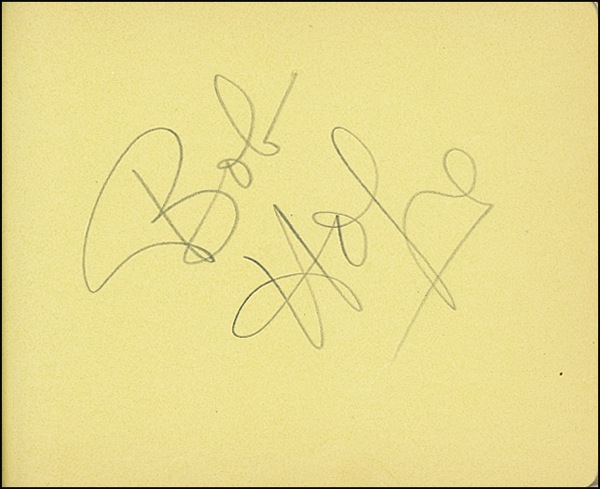 Vintage hardcover autograph album, 6.5 x 4.75, signed on the inside in fountain pen and pencil by twenty actors, actresses and celebrities, mainly comprising Bob Hope’s prewar touring troupe, with some adding brief inscriptions. Signers include: Bob Hope, Constance Bennett, Stepin Fetchit, Paul Muni, Lucille Ball, Orrin Tucker, Betty Hutton, Rochester, Marion Hutton and Donald O’Connor. Signatures are single-page, with clipped photos affixed next to a few of the signatures. In fine condition. R&R COA.