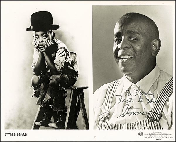 Glossy 10 x 8 composite then-and-now photo, signed and inscribed in black felt tip “To Larry, Best to you, Stymie.” Some creases and a repaired tear to right edge, otherwise fine condition. R&R COA.