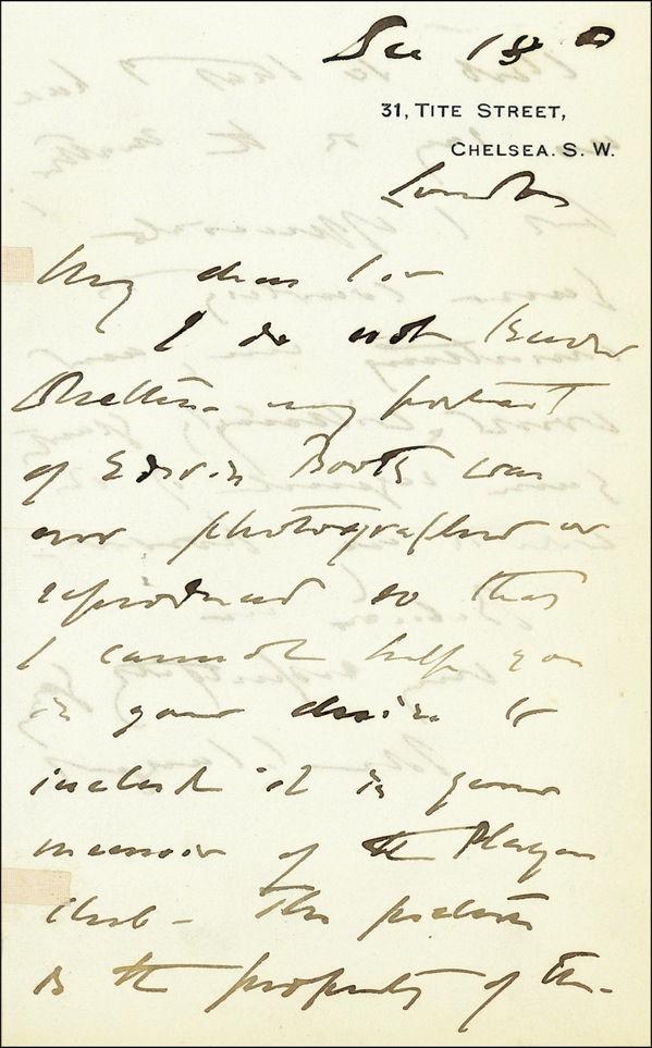 Distinguished American-born artist (1856–1925) who spent most of his career as an expatriate in Europe. While he painted a variety of subjects in various media, his fame rests primarily on his evocative, penetrating society portraits. ALS signed “John S. Sargent,” one page both sides, 4.5 x 7.25, December 18. Sargent replies to a request regarding his portrait of Edwin Booth. In part, “I do not know whether my portrait of Edwin Booth was ever photographed or reproduced so that I cannot help you in your desire to include it in your memoirs of the Player’s Club.” In fine condition, with light show-through from bold text on reverse and a bisecting horizontal mailing fold. R&R COA.
