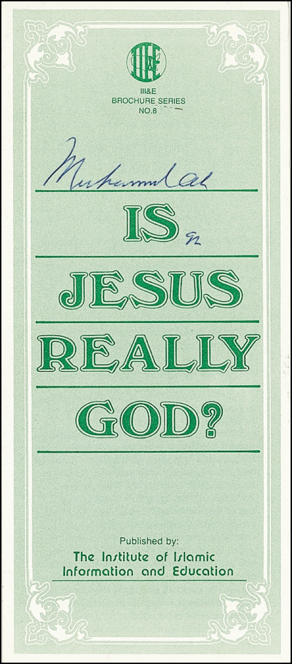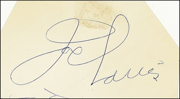 Ballpoint signature, “Joe Louis,” on an off-white heavy stock slip clipped from a menu; tri-fold Muslim brochure entitled Is Jesus Really God, signed on the cover in blue ballpoint by Muhammad Ali; and a felt tip signature, “Joe Frazier,” on an off-white 5 x 3 card. In fine condition, with diagonal crease and a small spot of toning to Louis’s signature. LOA Steve Grad/PSA/DNA and R&R COA.
