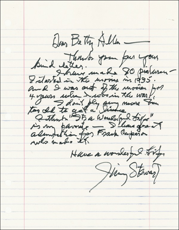 ALS signed “Jimmy Stewart,” one page on a lightly lined 8 x 10.5 sheet of looseleaf, no date [1980s–1990s]. Stewart writes to a fan. In part: “I have made 80 pictures—I started in the movies in 1935. and I was out of the movies for 4 years when I was in the war. I don’t fly anymore. I’m too old to get a license. I think ‘It’s a Wonderful Life’ is my favorite—I have great admiration for Frank Capra who made it. Have a wonderful life.” Light fold to one corner, otherwise fine, clean condition. R&R COA.