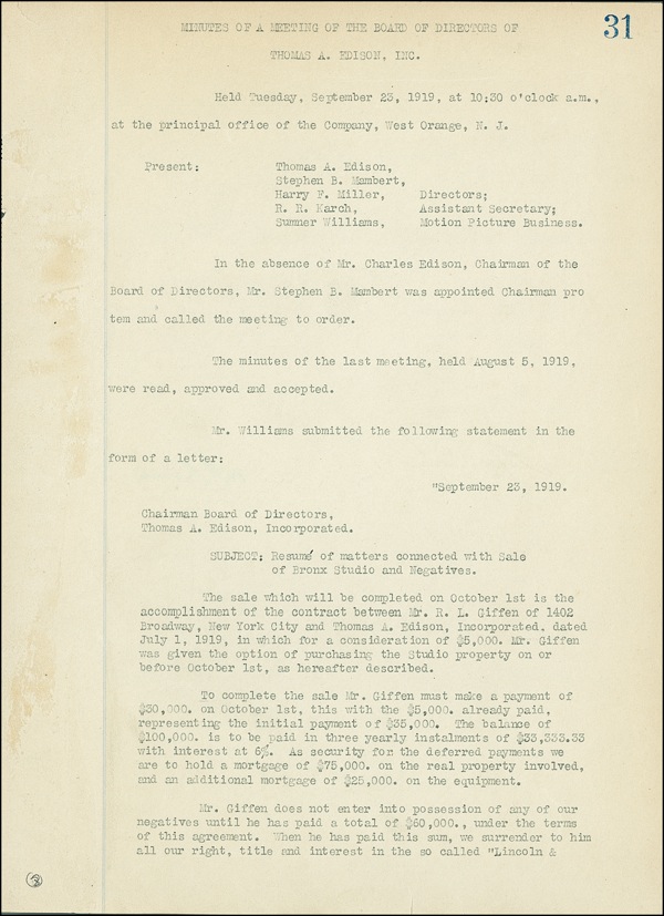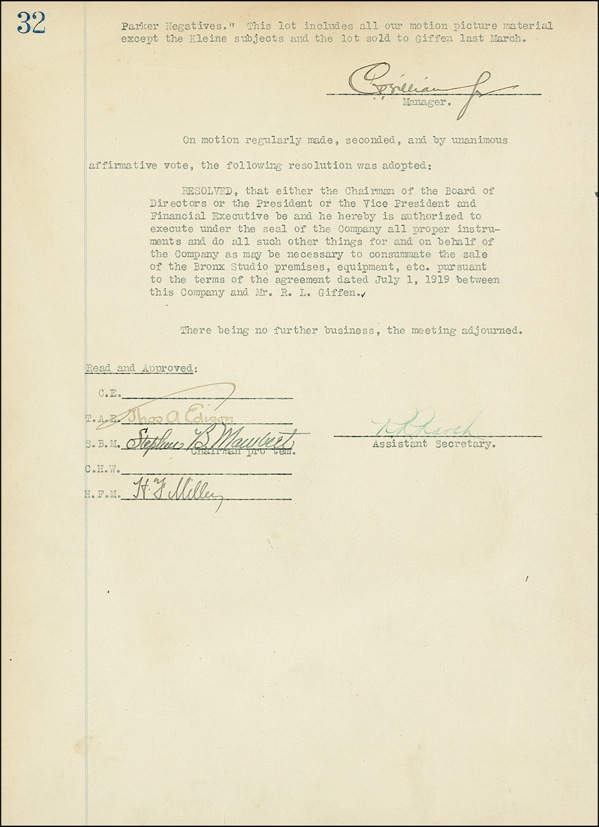 DS, signed “Thos. A. Edison,” one page both sides, 8 x 11, September 23, 1919. Minutes of a meeting of the Board of Directors of Thomas A. Edison, Inc. held in West Orange, New Jersey. After minutes of the previous meeting were approved, discussion moved on to the “resumé of matters connected with Sale of Bronx Studio and Negatives,” for a total of $135,000 to R. L. Giffen. Minutes also state that “Mr. Giffen does not enter into possession of any of our negatives until he has paid a total of $60,000, under the terms of this agreement. When he has paid this sum, we surrender to him all our right, title and interest in the so called ‘Lincoln & Parker Negatives.’ This lot includes all motion picture material except the Kleine subjects and the lot sold to Giffen last March.” Signed at the conclusion in black ink by Edison. In very good condition, with Edison’s signature a few shades light, but completely legible, mild toning and adhesive remnants to front of document. Following the closure of Edison's Black Maria studios in West Orange, New Jersey, he had new facilities built on Decatur Avenue and Oliver Place in The Bronx, New York. The studio made close to twelve hundred films for the Edison Company and the Edison Manufacturing Company until its closing in 1918. Some of the studio's notable productions include the first Frankenstein film in 1910 and the first ever serial made in 1912 titled What Happened to Mary? LOA John Reznikoff/PSA/DNA and R&R COA.