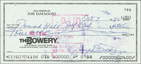 Uncommon personal check, 6 x 2.75, filled out and signed by DiMaggio, “Joseph DiMaggio,” payable to Round Hill Golf Club for $4.00, October 7, 1980. In very good condition, with staple holes to left edge, bank stamp to center and moderate show-through from stamps on reverse under signature. LOA Steve Grad/PSA/DNA and R&R COA.