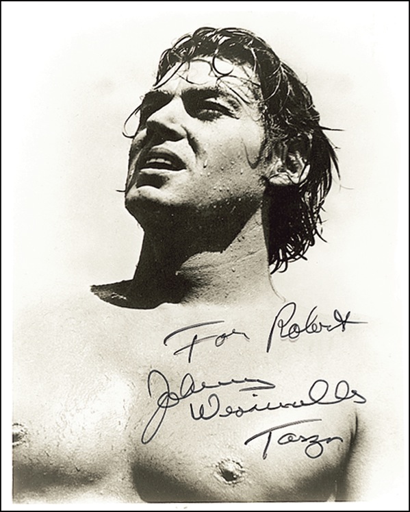 Glossy 8 x 10 photo of Weismuller as Tarzan, signed and inscribed in black felt tip ‘For Robert, Johnny Weismuller, Tarzan.” In fine condition, with some scattered light surface marks and dings. R&R COA.
