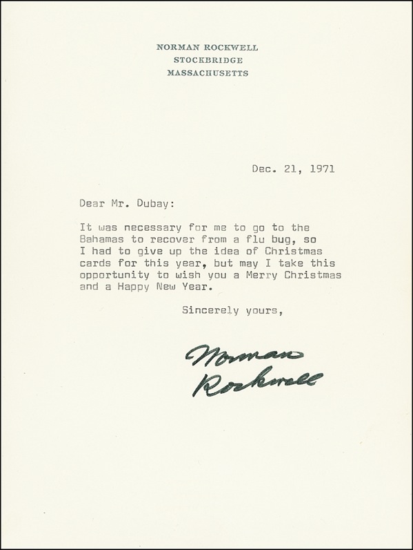 TLS, one page, 6 x 7.75, personal letterhead, December 21, 1971. Letter sent in lieu of a Christmas card. In full, “It was necessary for me to go to the Bahamas to recover from a flu bug, so I had to give up the idea of Christmas cards for this year, but may I take this opportunity to wish you a Merry Christmas and a Happy New Year.” Accompanied by the original mailing envelope. In very fine condition, with a bisecting horizontal mailing fold. R&R COA.