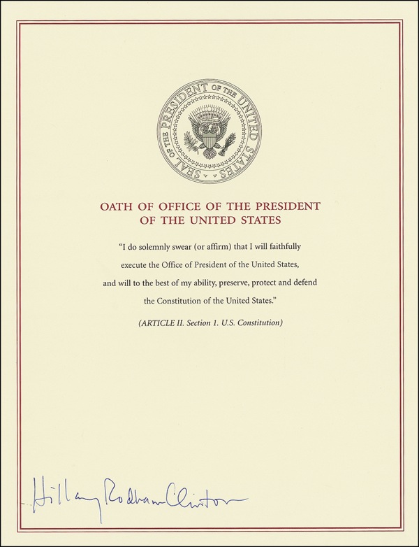 Souvenir typescript, one page, 8.5 x 11. A nicely printed copy of the presidential Oath of Office, signed at the bottom in blue ink, “Hillary Rodham Clinton.” In very fine condition. R&R COA.
